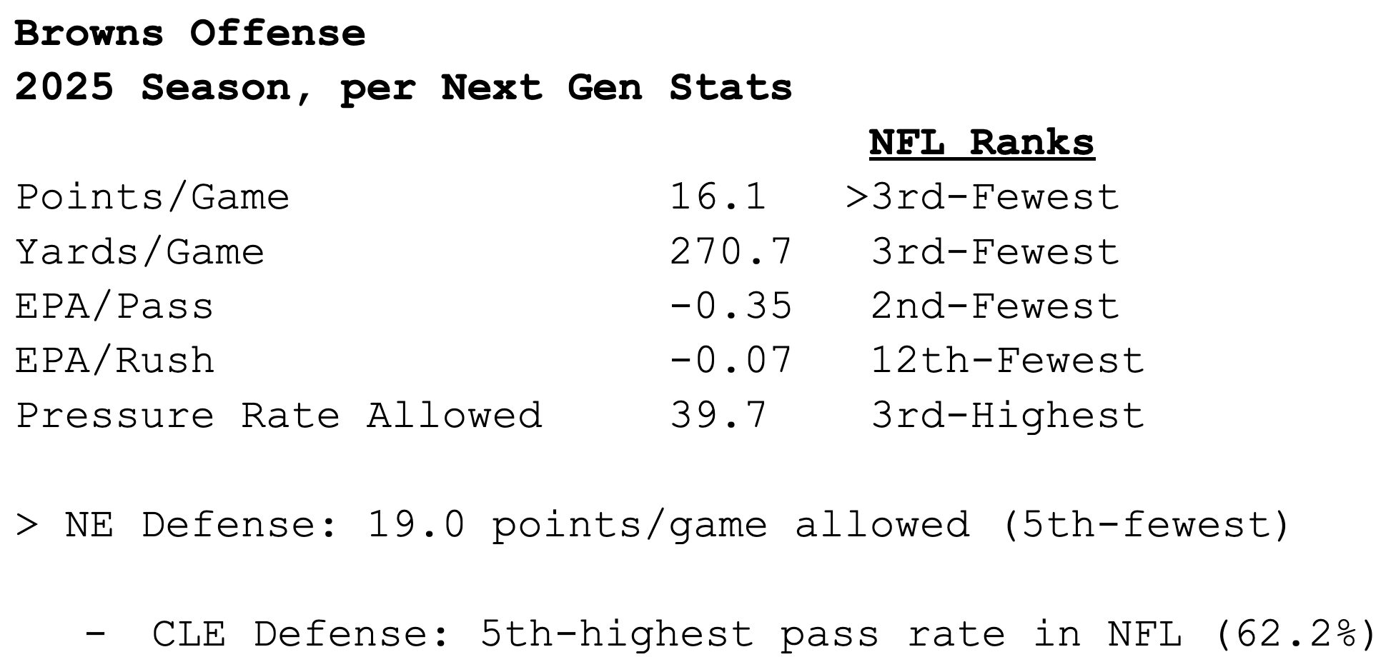 Meanwhile, the Browns’ offense is struggling by just about every metric, even after swapping out Joe Flacco for rookie Dillon Gabriel. They’ve also been forced into the league’s 5th-highest pass rate (62.2) due to consistent deficits.