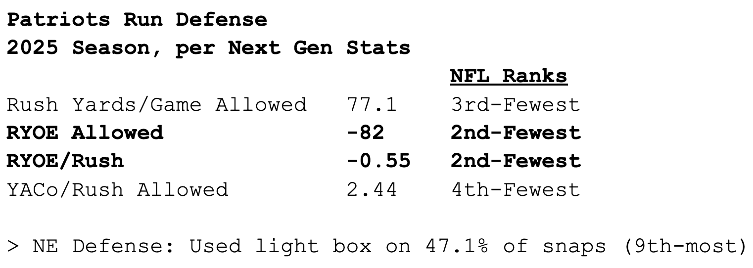 Despite using light boxes (six or fewer defenders) at one of the league’s highest rates, New England is the only team that hasn’t allowed a 50-yard rusher.