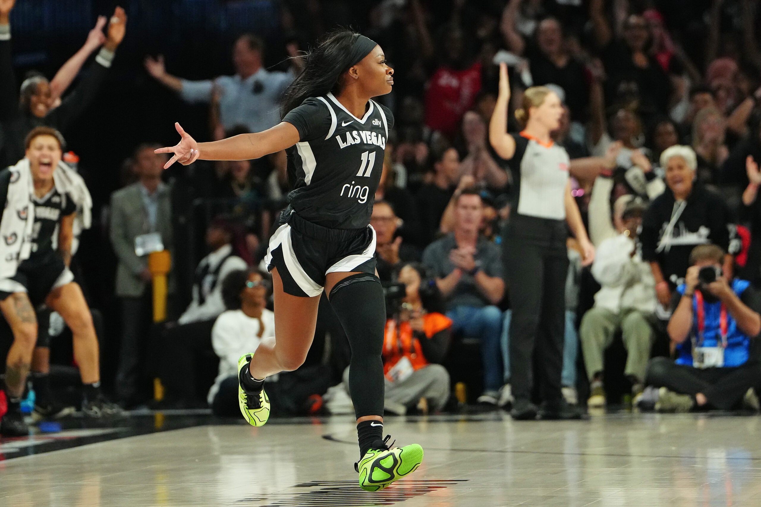 WNBA reporter Noa Dalzell reacts to the Las Vegas Aces’ win over the Phoenix Mercury in Game 1 of the WNBA Finals.