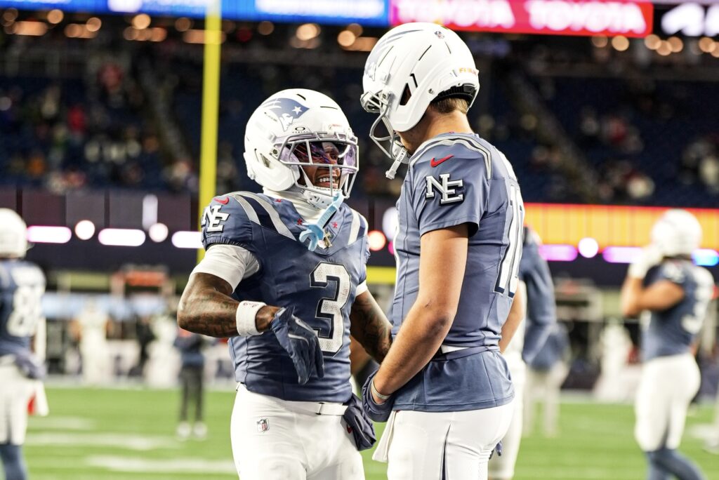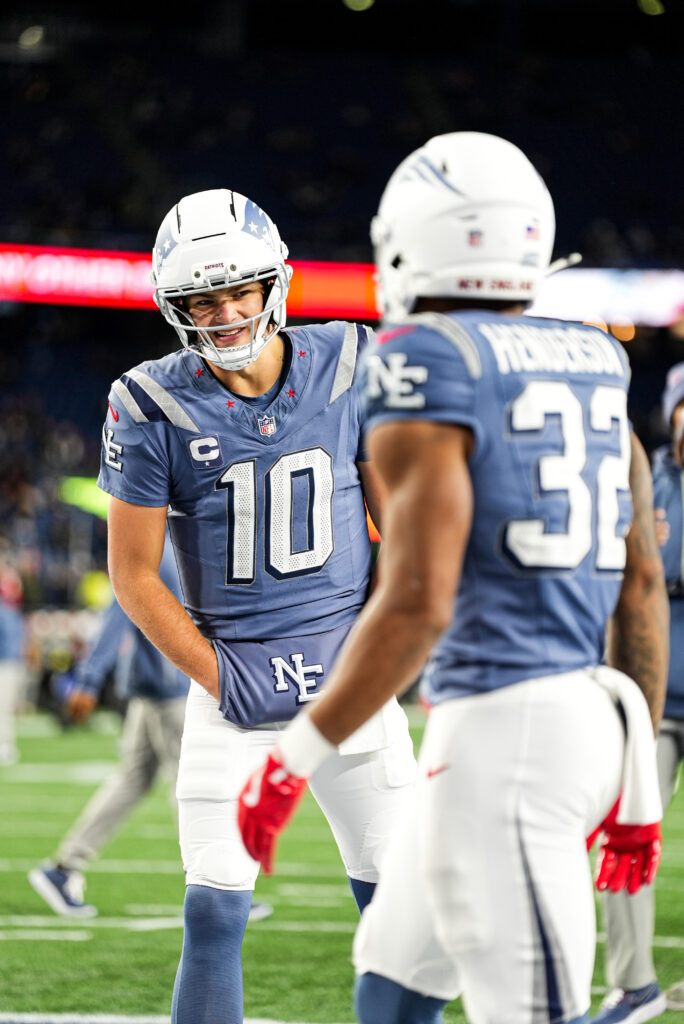 Drake Maye and DeMario Douglas at Patriots Jets Week 11. Photo by CLNS Media.