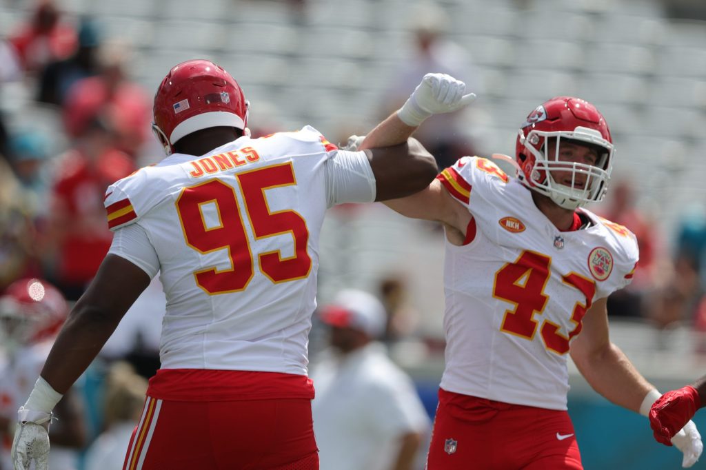 Sep 17, 2023; Jacksonville, Florida, USA; Kansas City Chiefs defensive tackle Chris Jones (95) and linebacker Jack Cochrane (43) warm up before a game against the Jacksonville Jaguarsat EverBank Stadium. Mandatory Credit: Nathan Ray Seebeck-USA TODAY Sports